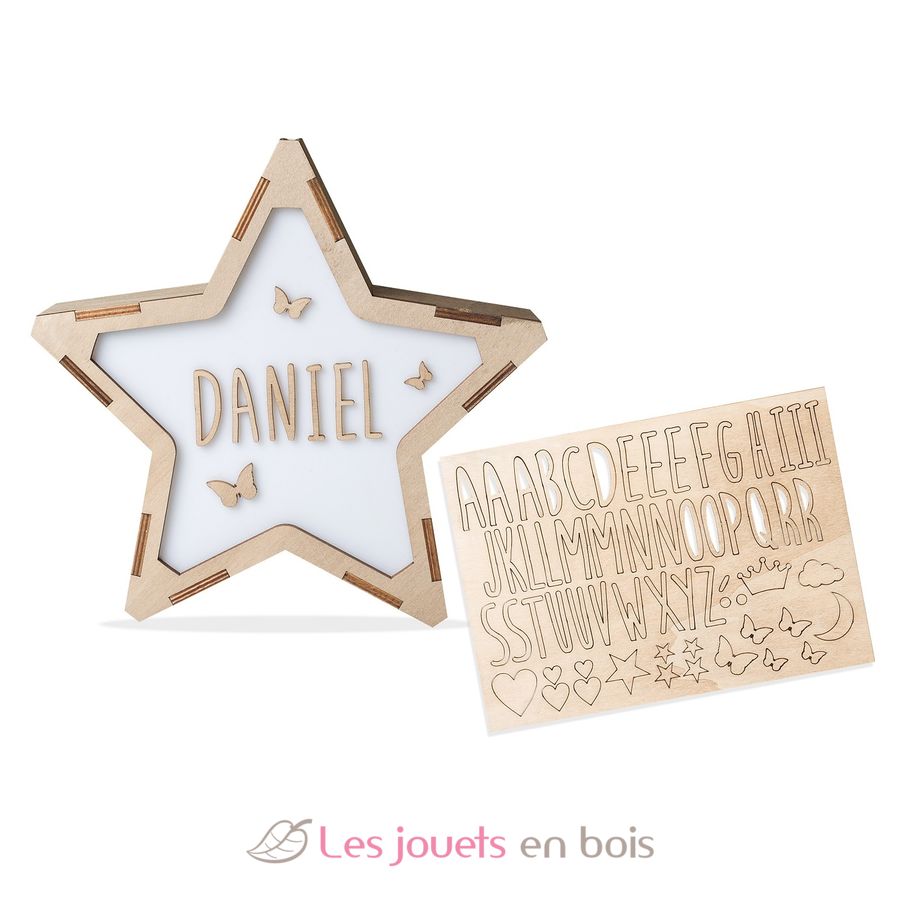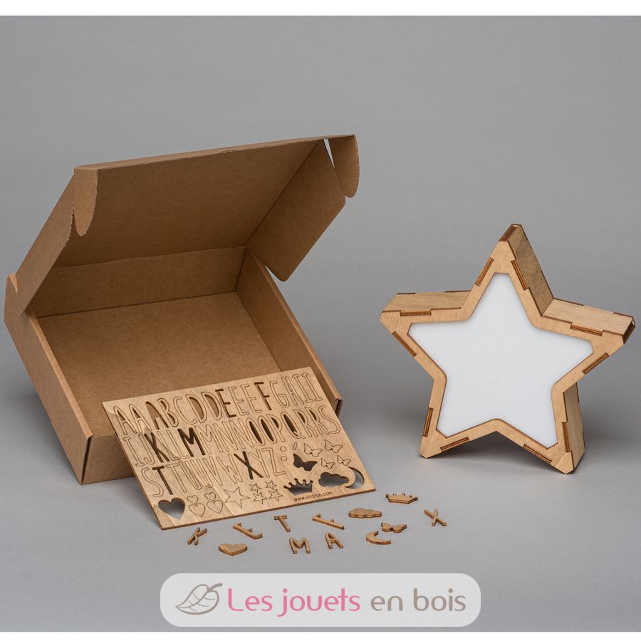 Il kit include: 1 stella luminosa in legno e metacrilato con illuminazione a LED; 1 foglio di lettere e simboli in legno autoadesivi.