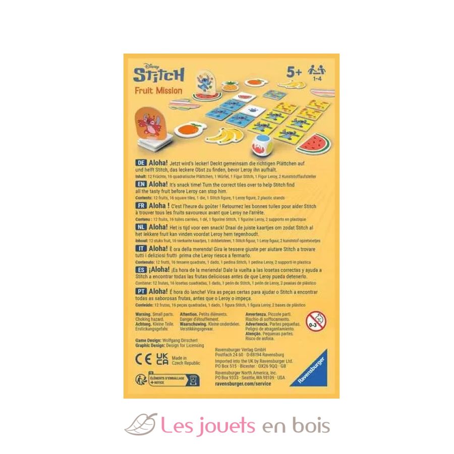 Sfacciato, selvaggio e pieno di energia. Stitch non è solo un alieno caotico, è una vera star dell'universo Disney. In questa avventura cooperativa di memoria è necessario lo spirito di squadra! Sul tavolo sono disposte in cerchio 12 carte frutta che costituiscono i turni di gioco. Queste contengono un totale di 16 carte quadrate in due colori. Alcune nascondono i frutti che state cercando, altre indicano il numero di spazi che Stitch può avanzare. Tutti devono ricordare dove si trova ogni cosa, perché solo così Stitch potrà trovare rapidamente il suo frutto preferito. Ma attenzione: Leroy è veloce. Un gioco di memoria vario per tutta la famiglia e un regalo ideale per ogni occasione per bambini dai 5 anni in su.