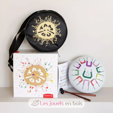 Questo tamburo è dotato di 11 note, differenziate da numeri e colori, che emettono suoni armonici rilassanti. Può essere suonato in diversi modi, ognuno dei quali produce una diversa intensità sonora: con le bacchette, con la punta delle dita o con le mani.