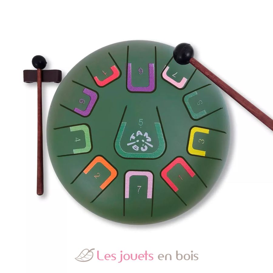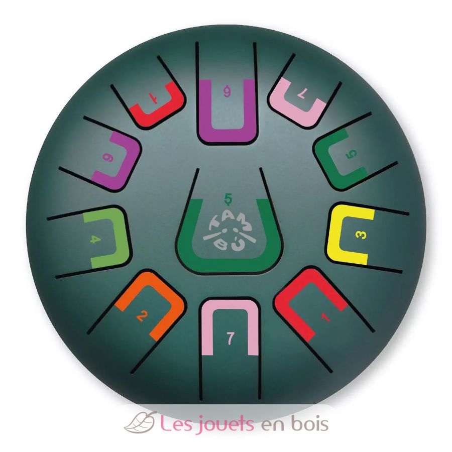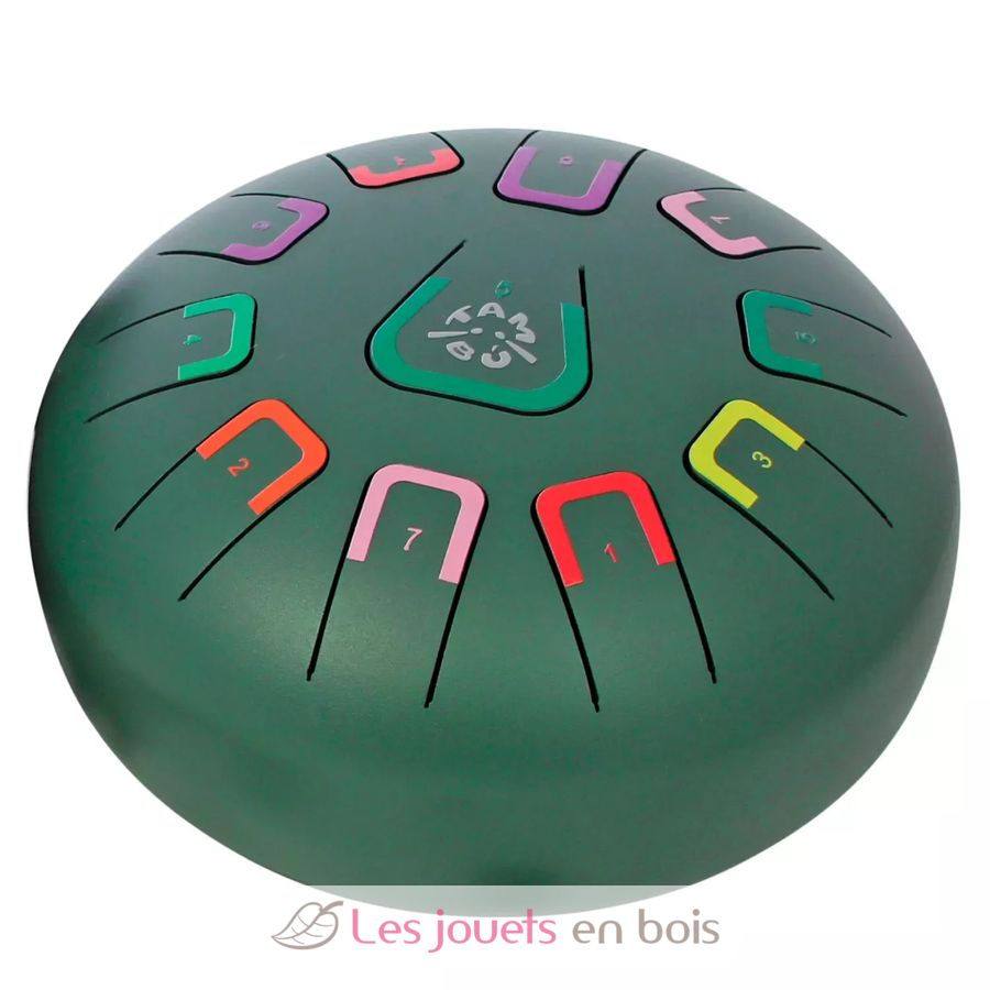 Questo tamburo è dotato di 11 note, differenziate da numeri e colori, che emettono suoni armonici rilassanti. Può essere suonato in diversi modi, ognuno dei quali produce una diversa intensità sonora: con le bacchette, con la punta delle dita o con le mani.