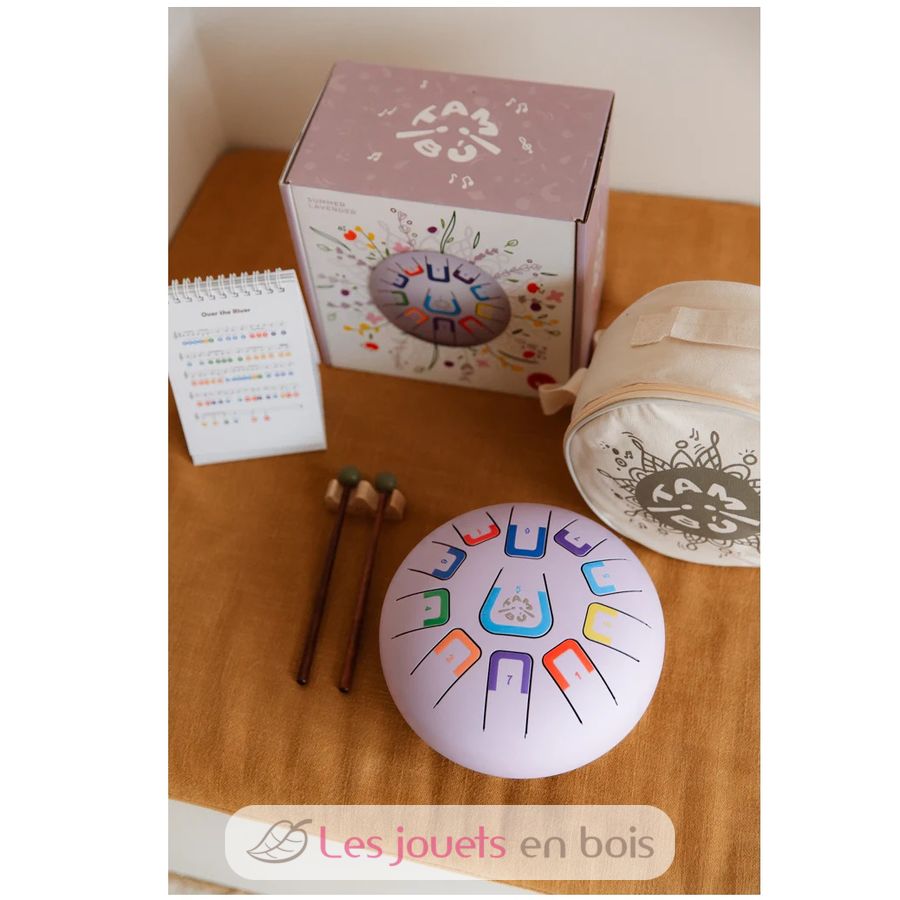 Questo tamburo è dotato di 11 note, differenziate da numeri e colori, che emettono suoni armonici rilassanti. Può essere suonato in diversi modi, ognuno dei quali produce una diversa intensità sonora: con le bacchette, con la punta delle dita o con le mani.