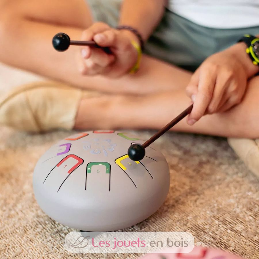 Questo tamburo è dotato di 8 note, differenziate da numeri e colori, che emettono suoni armonici rilassanti. Può essere suonato in diversi modi, ognuno dei quali produce una diversa intensità sonora: con le bacchette, con la punta delle dita o con le mani.