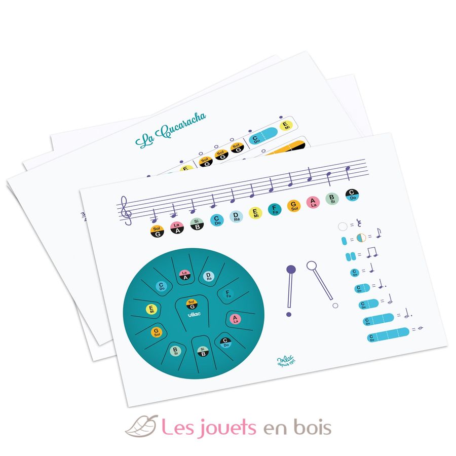 Con un diametro di 20 cm, è dotato di due bacchette e 14 spartiti musicali creati appositamente per questo strumento, consentendo ai bambini di suonare una varietà di melodie rilassanti e intuitive senza alcuna conoscenza musicale pregressa.