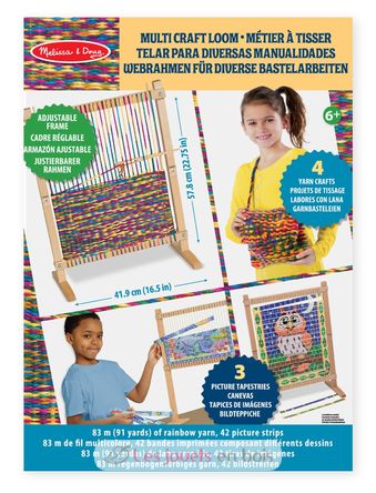 I bambini saranno entusiasti di liberare la loro creatività con questo telaio per realizzare una varietà di mestieri. Grazie al telaio regolabile facile da usare, all'ago di legno sovradimensionato e agli 83 metri di filato arcobaleno, i bambini potranno realizzare sciarpe, sottobicchieri con nappe, borse con coulisse, tote bag fatte a mano o qualsiasi altra cosa creino! Perfetto per tutti i livelli di abilità, questo telaio include anche tre arazzi illustrati da tessere. Include un telaio regolabile, un ago di legno sovradimensionato, materiale da lavoro, un libretto di schemi illustrati, 83 metri di filato arcobaleno e 42 strisce di immagini. Laccio in legno di marca Melissa&Doug, numero di parte 19381.