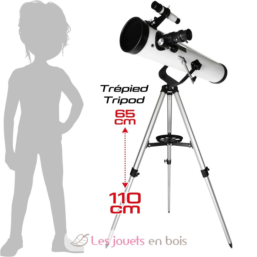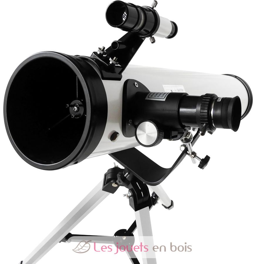 Tubo interamente in metallo. Apertura di 76 mm di diametro e lunghezza focale di 700 mm. Tre oculari intercambiabili inclusi: oculare Kellner da 20 mm, oculare da 6 mm e oculare Kellner da 10 mm. Treppiede in alluminio con due posizioni di altezza: 65 cm e 110 cm.
