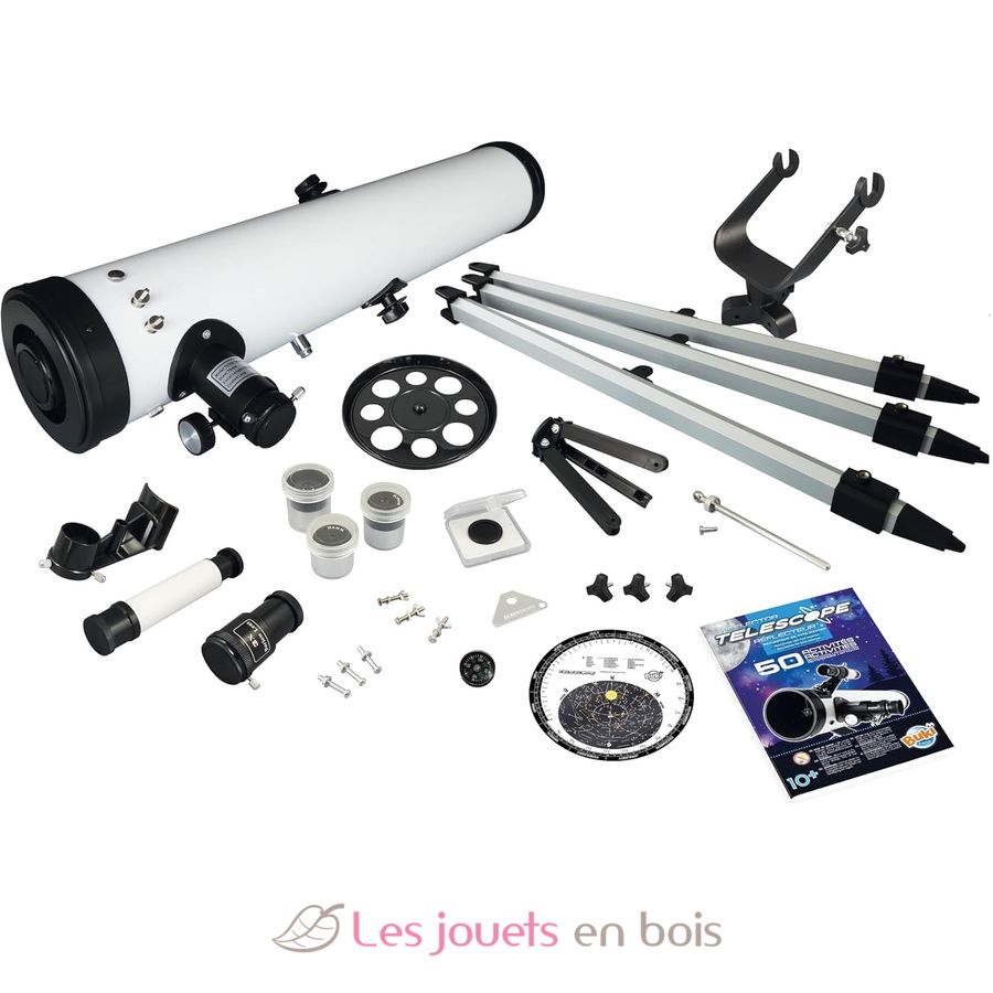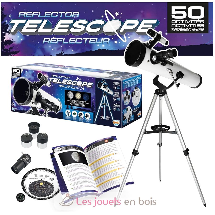 Un telescopio riflettore con libretto di istruzioni con 50 attività per esplorare il cielo stellato, i pianeti e il paesaggio lunare.