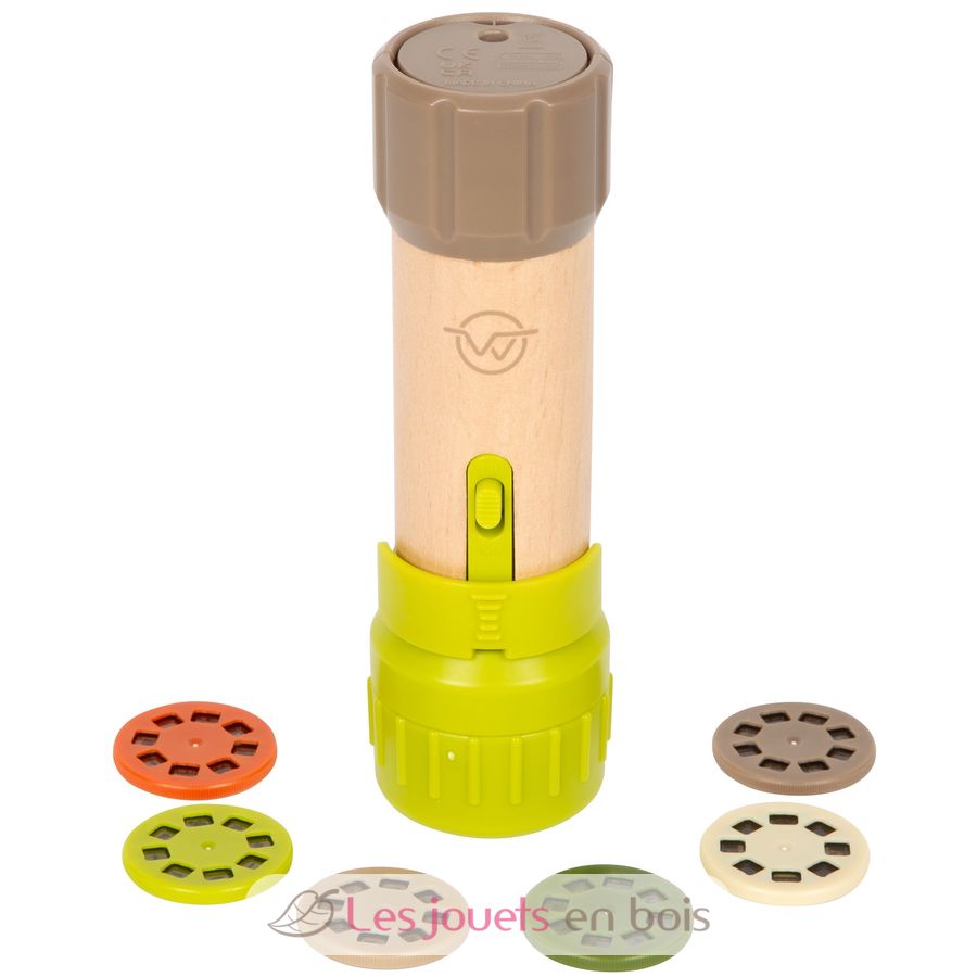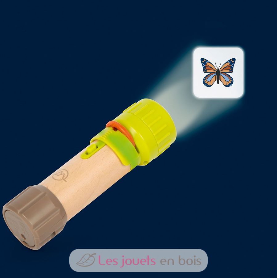 Questo giocattolo per esploratori combina due funzioni in una: come torcia assicura luce nell'ombra, come proiettore di immagini porta interessanti contenuti didattici sulla parete, sul soffitto o sul pavimento.
