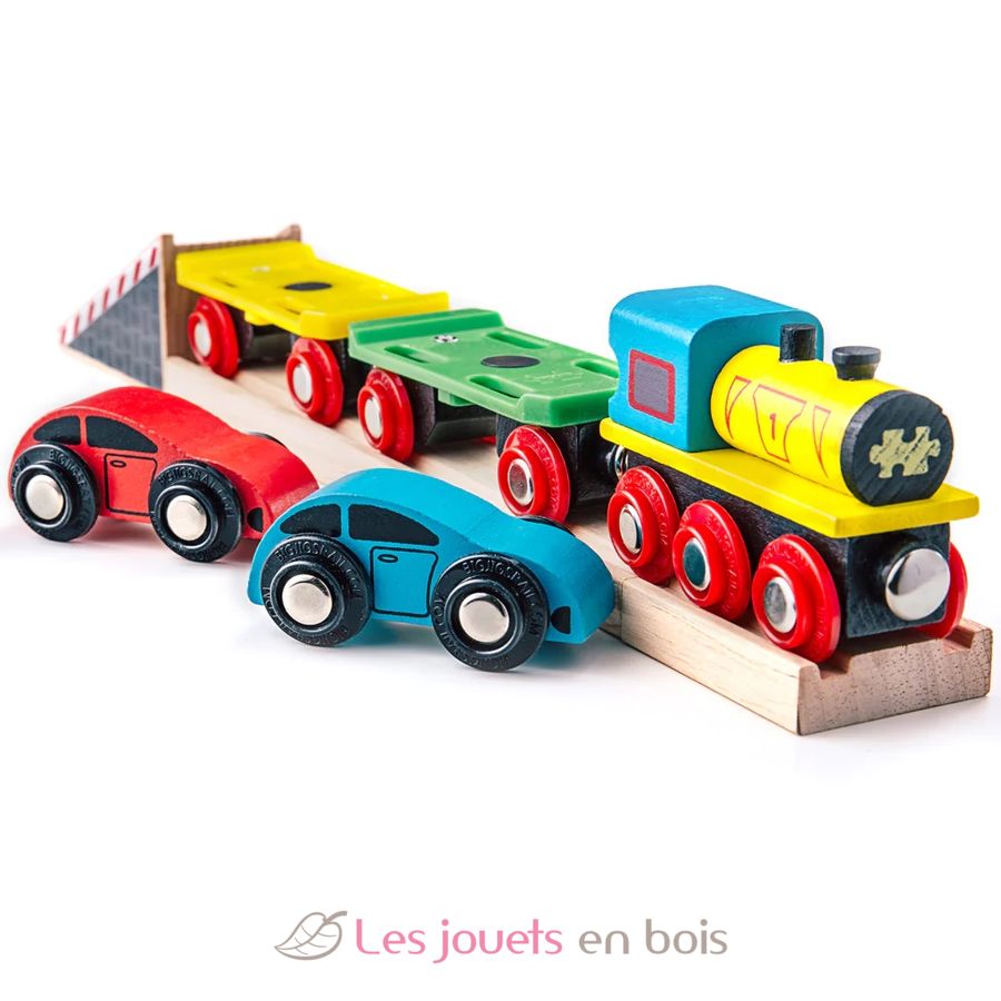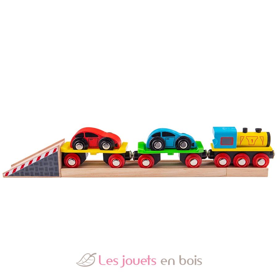 Questo treno per il trasporto di auto è l'aggiunta perfetta a un circuito di treni in legno. Comprende una locomotiva in legno, due vagoni, due rotaie e una rampa per auto.