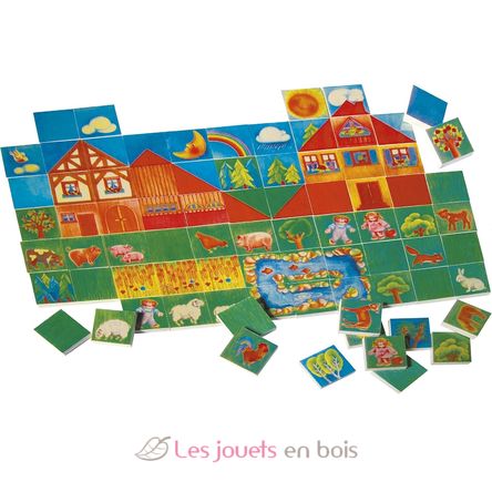 Questo puzzle è composto da 80 tessere in legno serigrafate (4,5 x 4,5 cm) che possono essere combinate in molteplici modi. Ad ogni gioco il bambino crea un nuovo mondo.