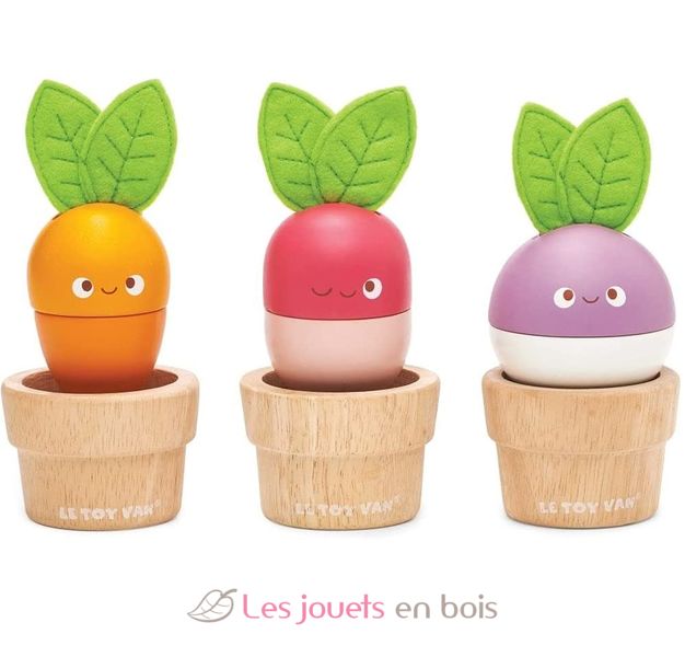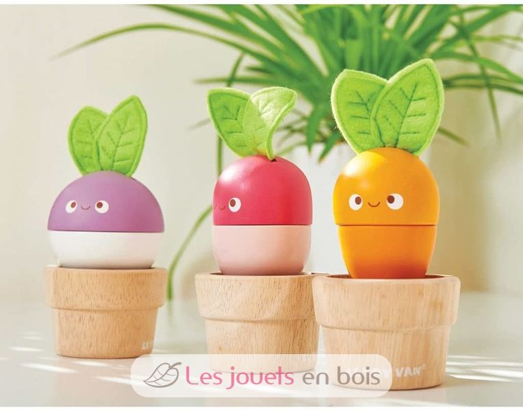 Questo gioco di impilamento, realizzato in legno di gomma, è ideale per i bambini che sviluppano la coordinazione e la motricità fine a partire dai 18 mesi. Include 3 ortaggi in legno con foglie di feltro: una carota, una barbabietola e un ravanello. Le verdure hanno 3 parti intercambiabili, così il bambino può divertirsi a creare verdure originali.